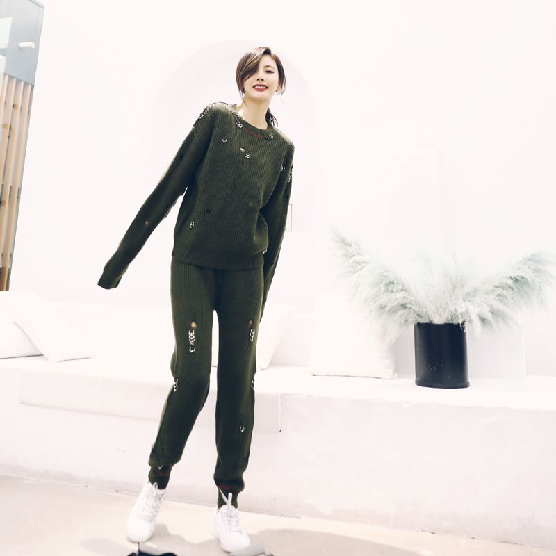 名媛淑女氣質2018秋季新款針織破洞休閑兩件套毛衣時尚網紅套裝潮