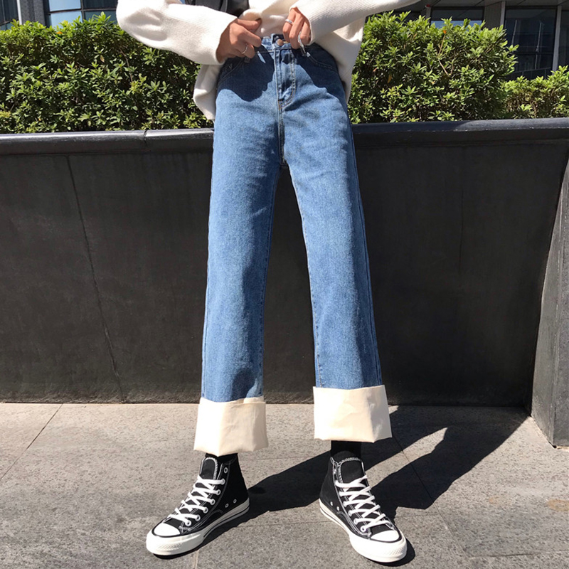 / 高腰顯瘦撞色卷邊牛仔褲女秋冬裝新款復古風直筒寬松闊腿九分褲子