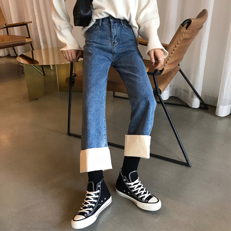 高腰顯瘦撞色卷邊牛仔褲女秋冬裝新款復古風直筒寬松闊腿九分褲子