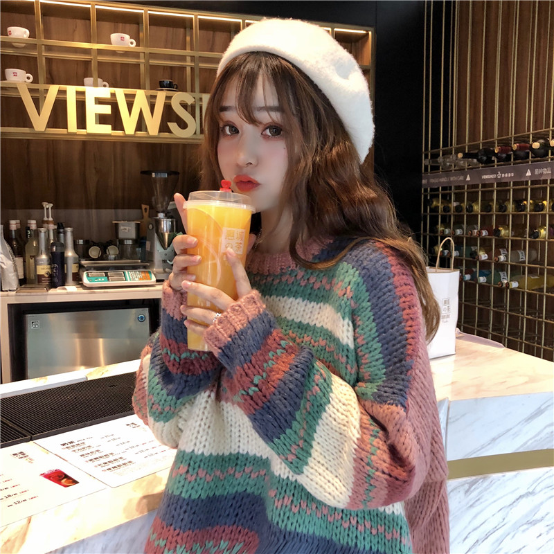 秋季女裝韓版慵懶風復古寬松拼色彩條網紅套頭針織衫毛衣上衣外套