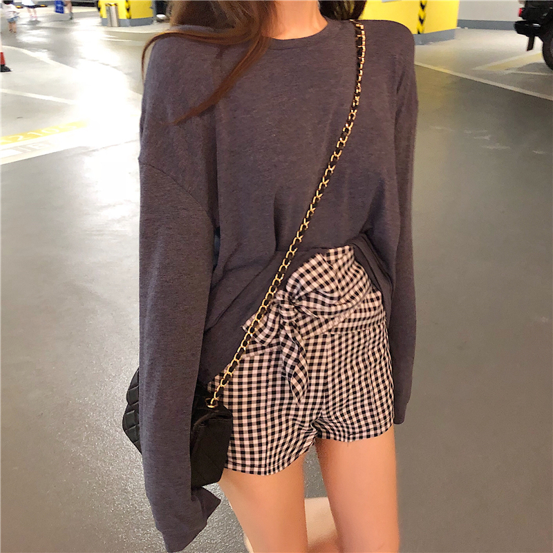 / 新款時尚套裝寬松學生百搭長袖上衣+顯瘦系帶高腰格子短褲分開拍