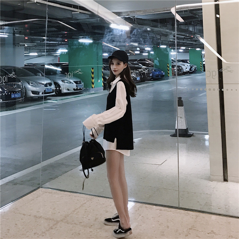 / 秋季女神套裝秋兩件套學院風chic黑色馬甲+簡約性感白色長袖襯衫