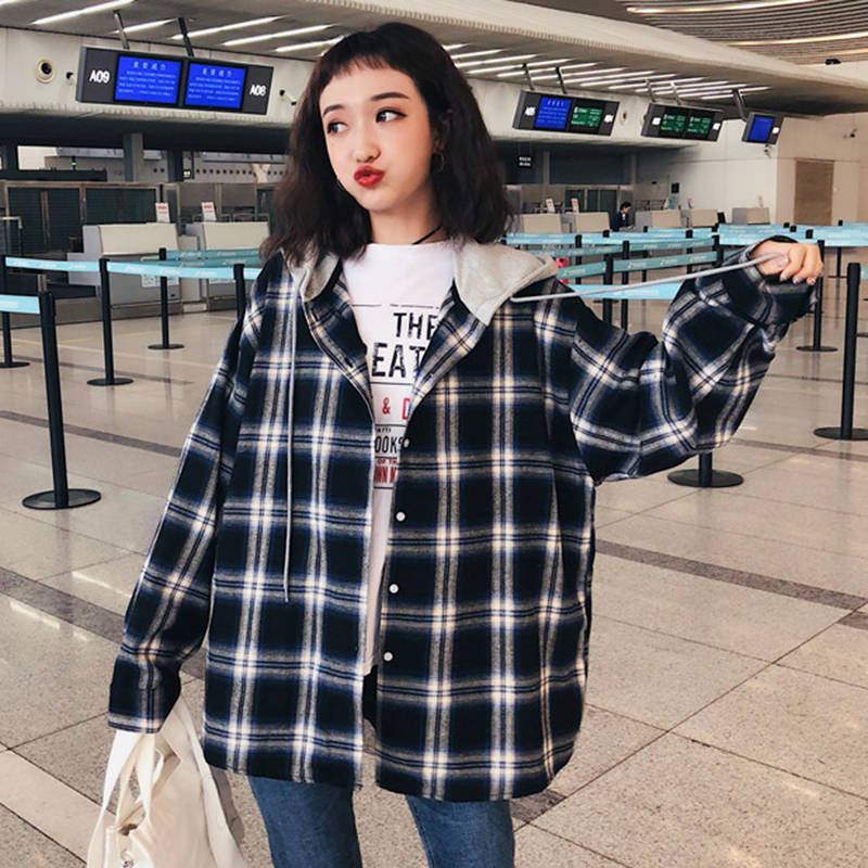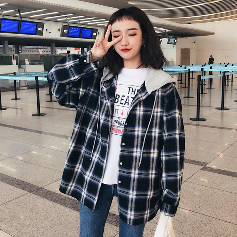 / 時尚磨毛假兩件格子襯衫女秋裝新款休閑外套學生百搭寬松長袖上衣