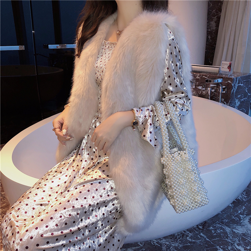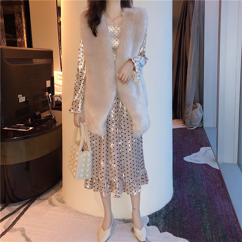 / 女神套裝秋新款溫暖毛毛馬甲皮草外套+絲絨波點印花連衣裙兩件套
