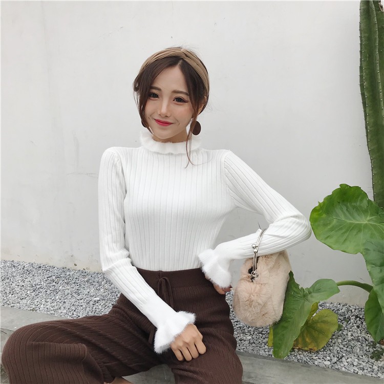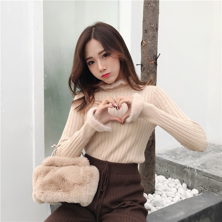 / 韓國拼接毛毛袖坑條毛衣女2018新款修身顯瘦半高領打底針織衫上衣