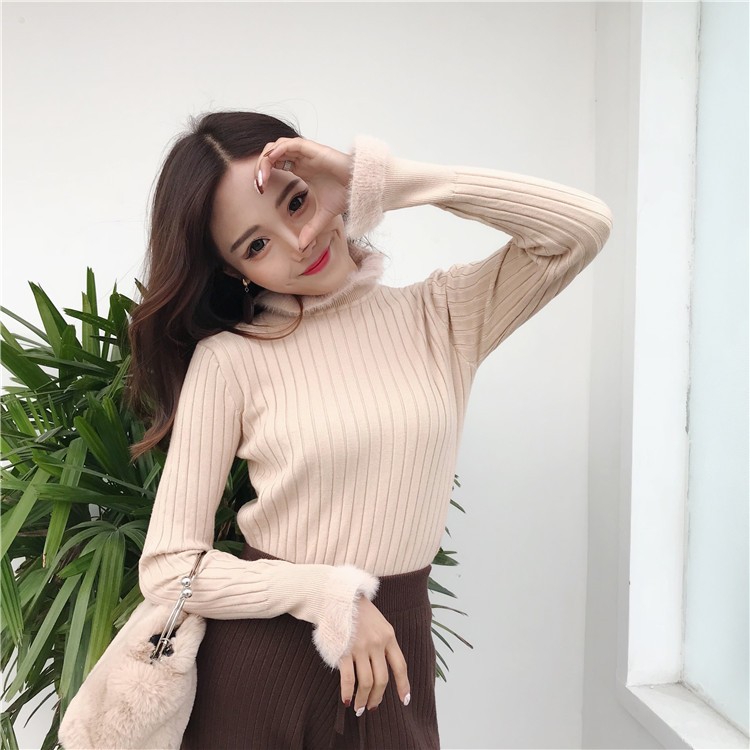 韓國拼接毛毛袖坑條毛衣女2018新款修身顯瘦半高領打底針織衫上衣