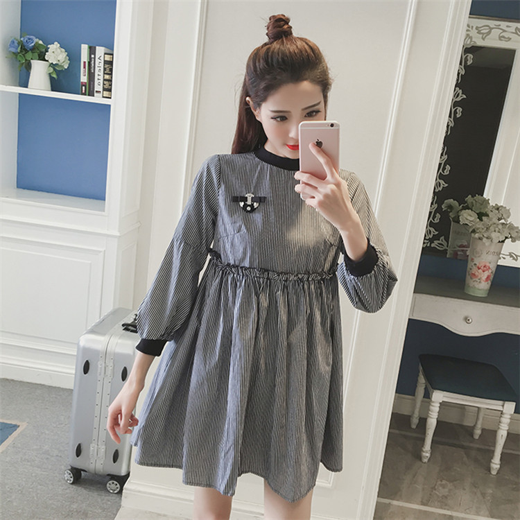 春裝新款女裝韓版寬松A字裙女顯瘦中長款條紋長袖連衣裙秋冬