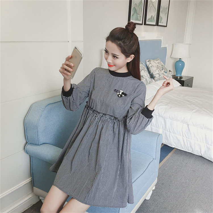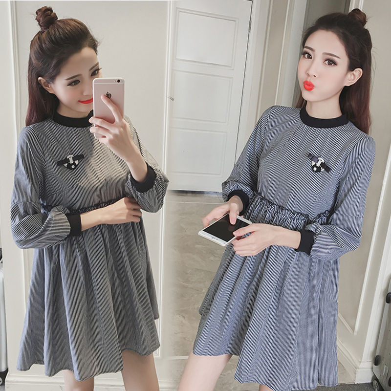 / 春裝新款女裝韓版寬松A字裙女顯瘦中長款條紋長袖連衣裙秋冬