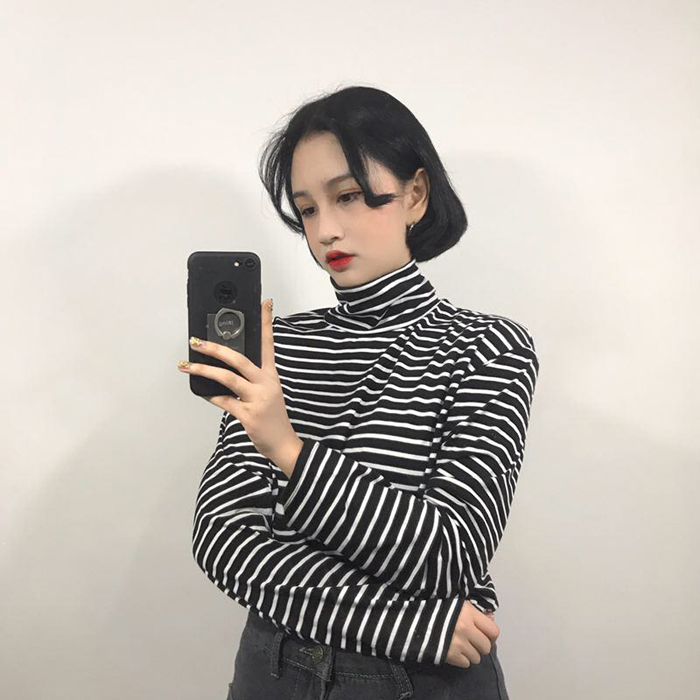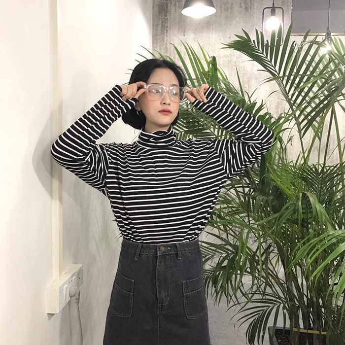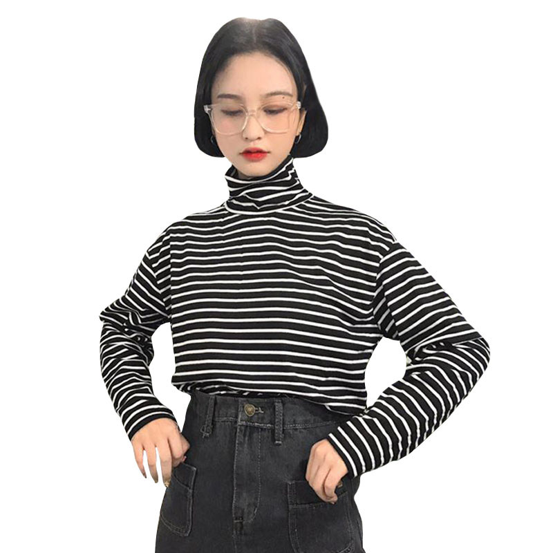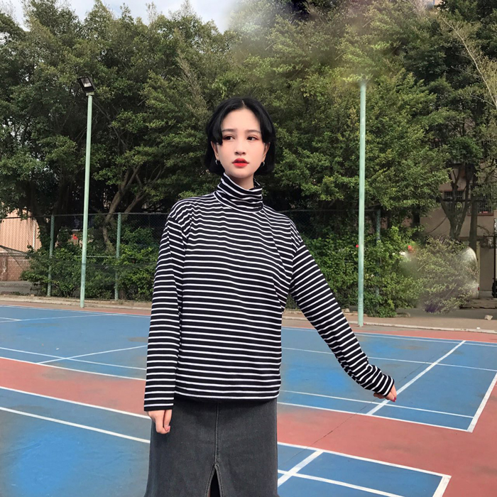 秋冬女裝韓版寬松百搭學院風高領長袖條紋t恤打底衫顯瘦上衣學生