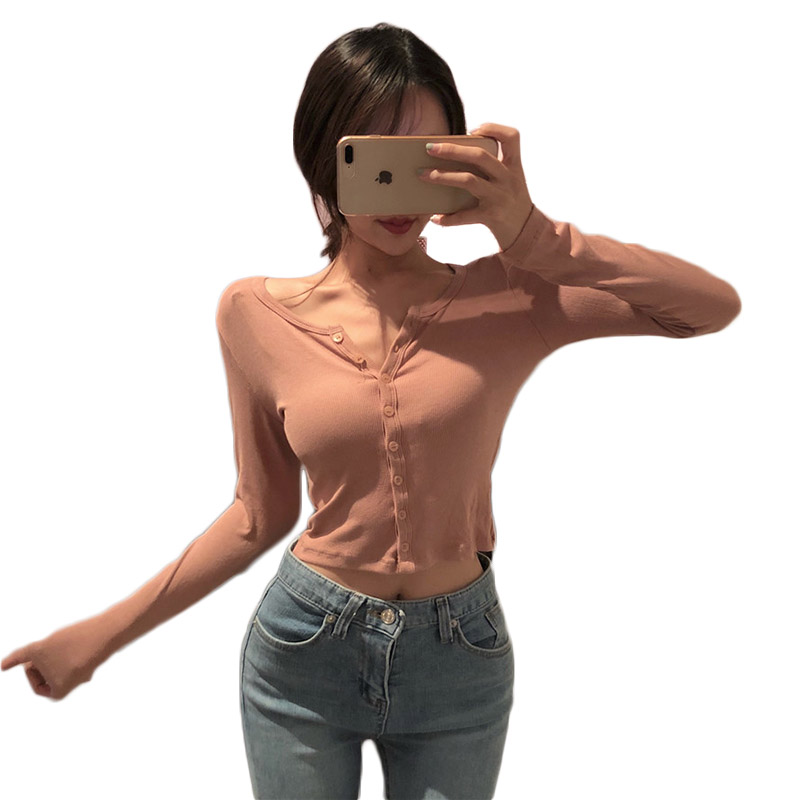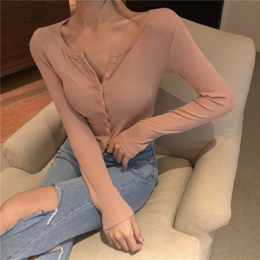 秋裝女2018新款時尚韓風修身顯瘦百搭紐扣長袖T恤純色打底衫上衣