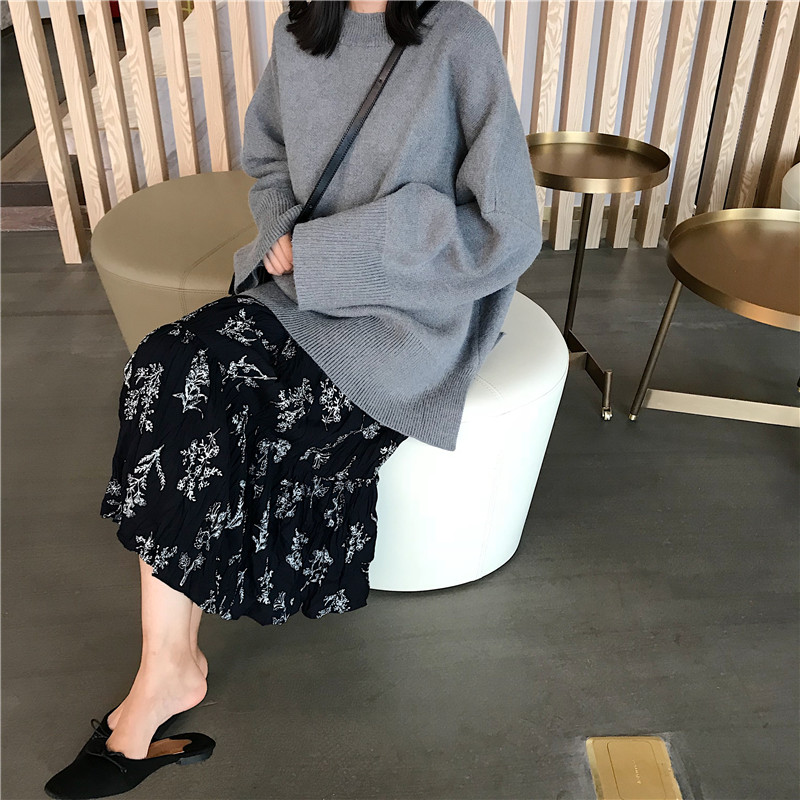 / 套裝女秋2018新款寬松純色套頭毛衣+百搭壓褶碎花半身裙兩件套裝