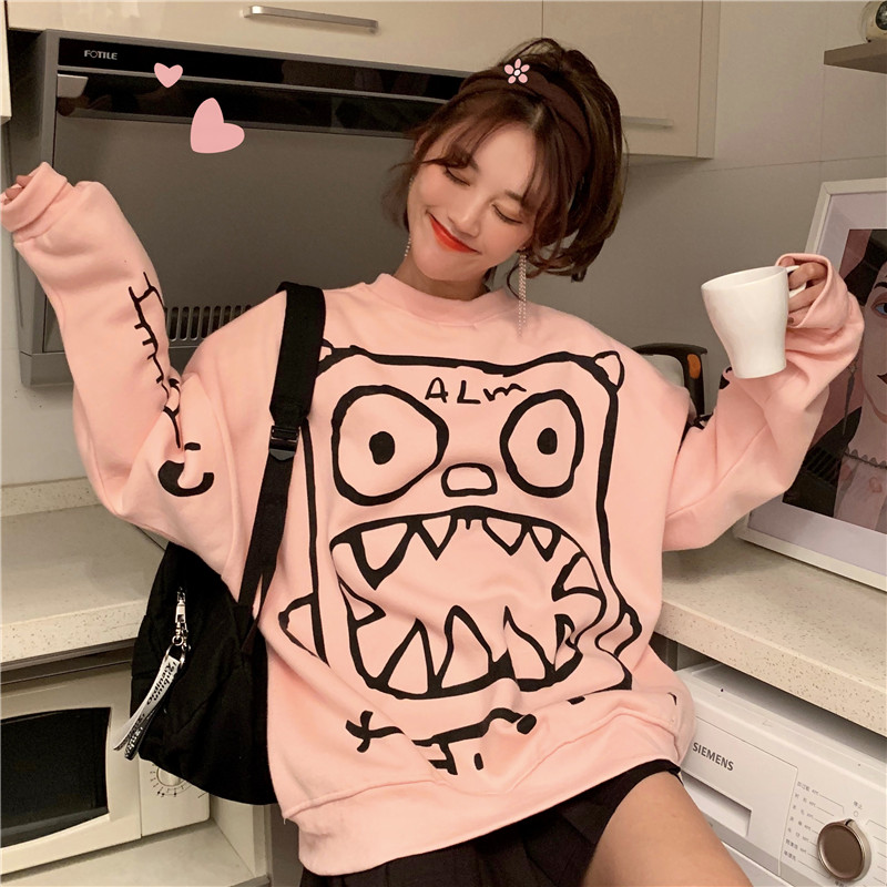 chic上衣慵懶風寬松衛衣女秋冬2018新款百搭涂鴉小怪獸加絨衛衣潮