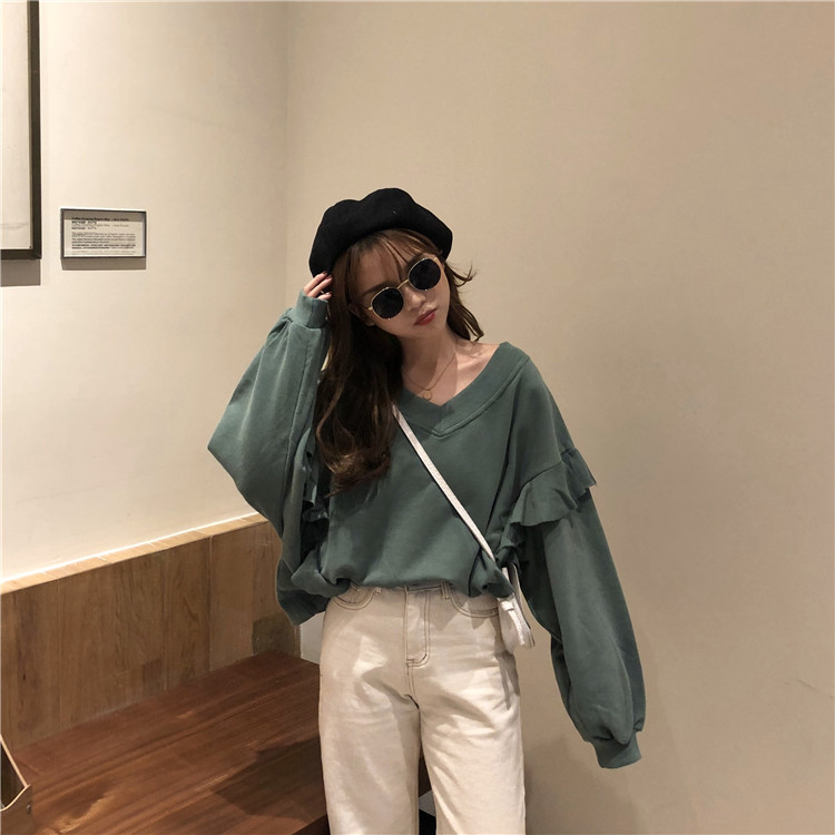 / 秋季韓版chic復古純色V領BF風寬松荷葉邊套頭超火衛衣上衣外套女