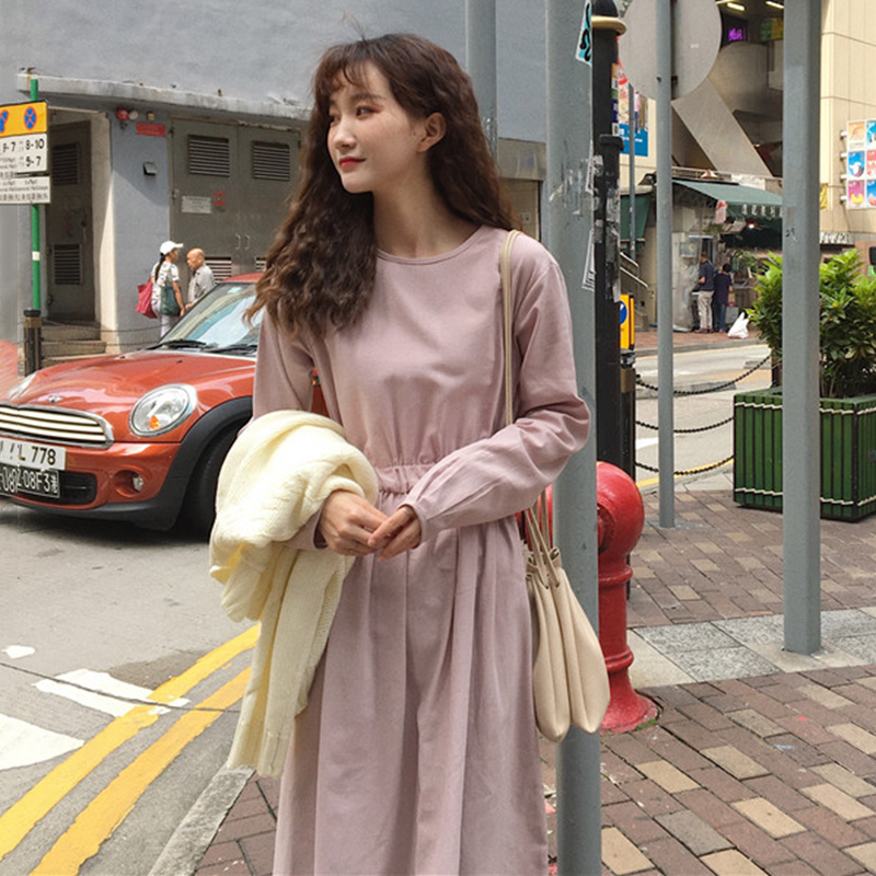 / 學院風中長裙子秋裝女2018新款純色寬松顯瘦連衣裙松緊高腰A字裙