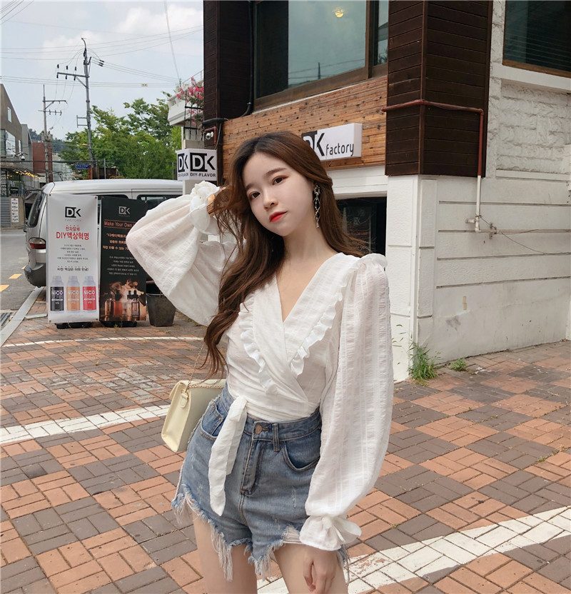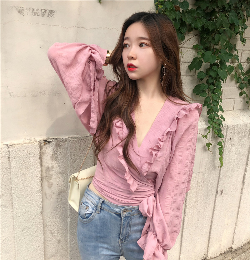 / 2018秋季新款純色綁帶V領韓版洋氣小衫復古燈籠袖雪紡衫女裝上衣