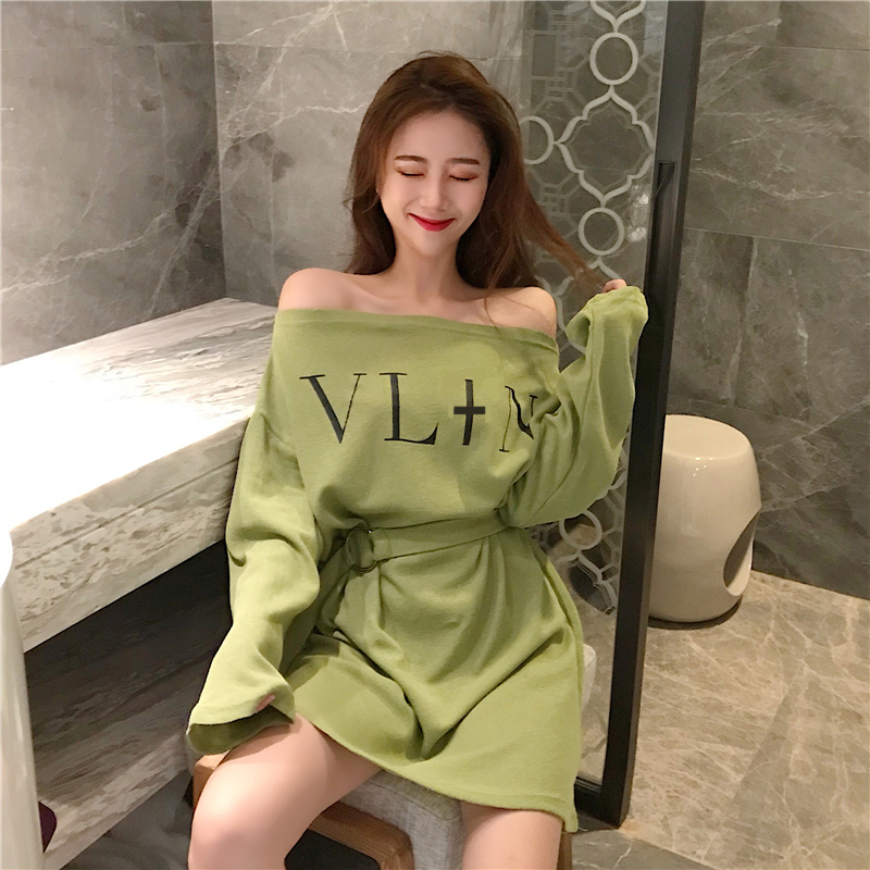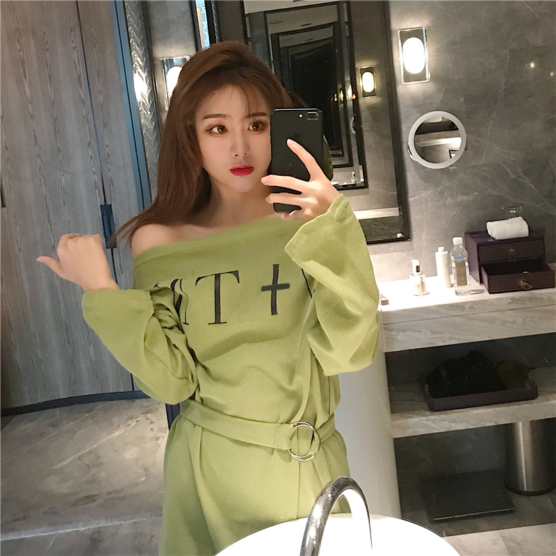 / 港味chic2018新款韓版一字露肩晚晚風百搭高腰綁帶寬松顯瘦連衣裙