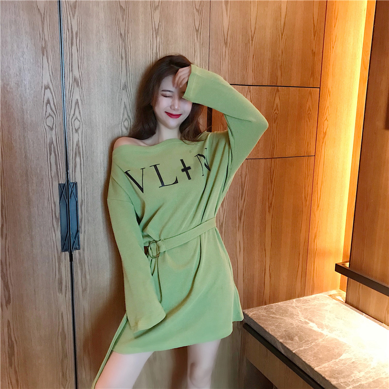 港味chic2018新款韓版一字露肩晚晚風百搭高腰綁帶寬松顯瘦連衣裙