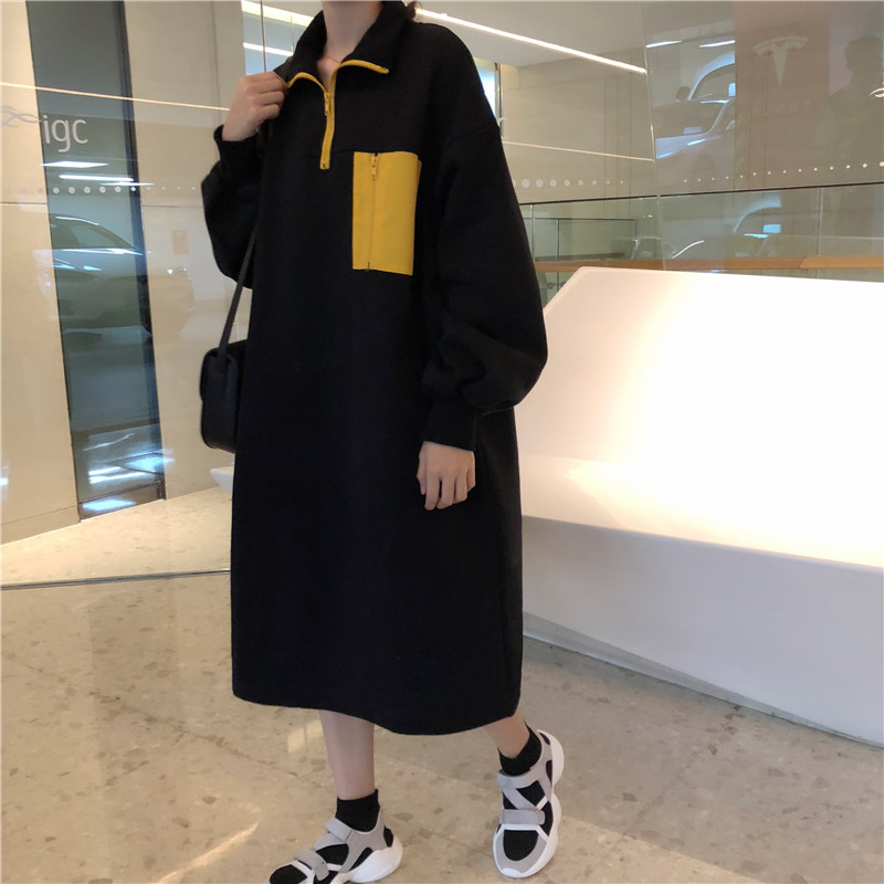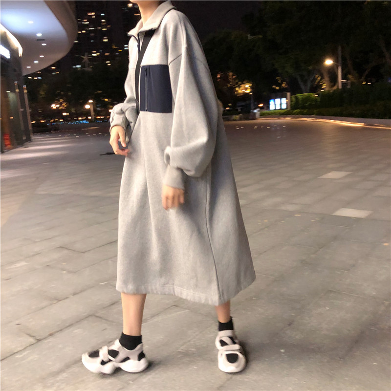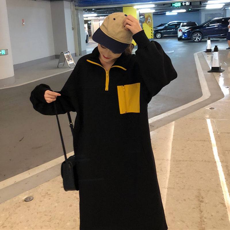 秋冬新款女裝韓版寬松撞色拉鏈口袋加厚套頭衛衣裙中長款休閑外套