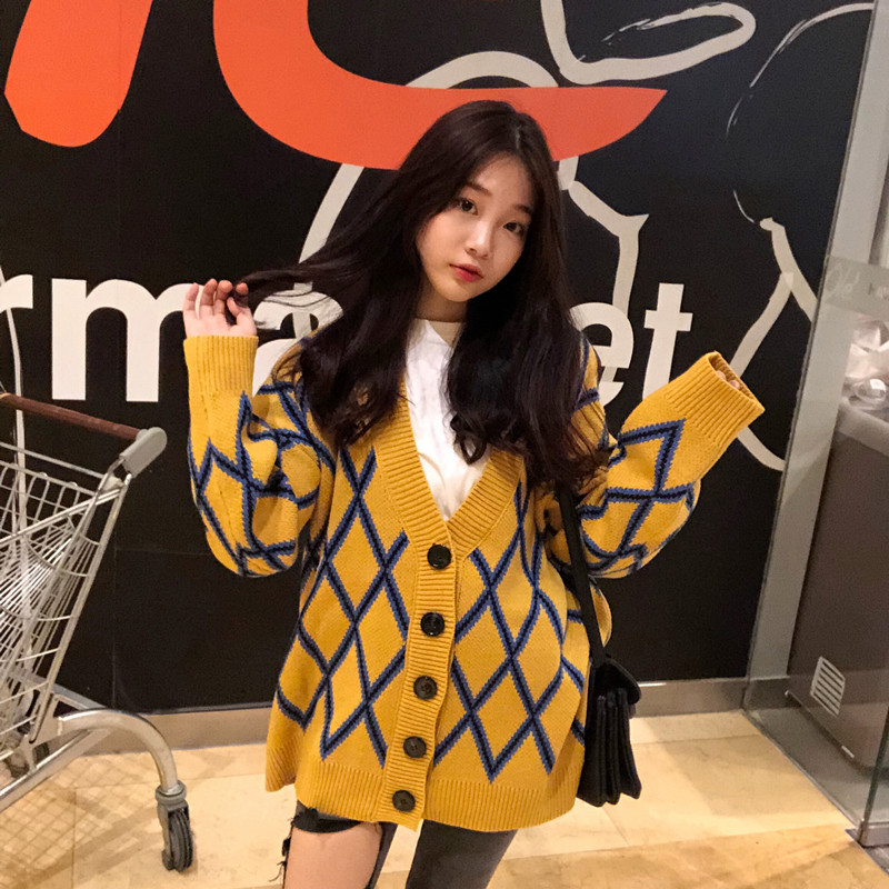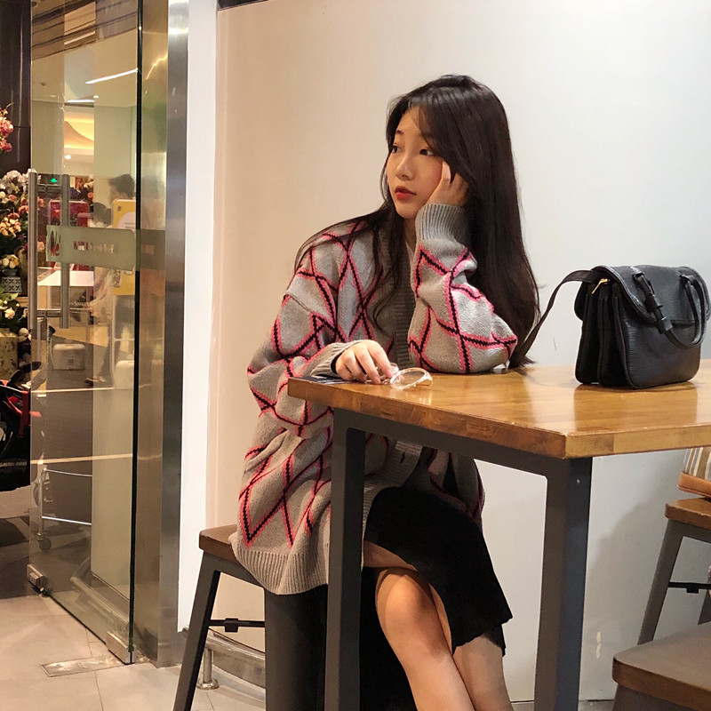/ 秋冬2018新款韓版慵懶風菱格寬松中長款網紅針織衫毛衣開衫外套女