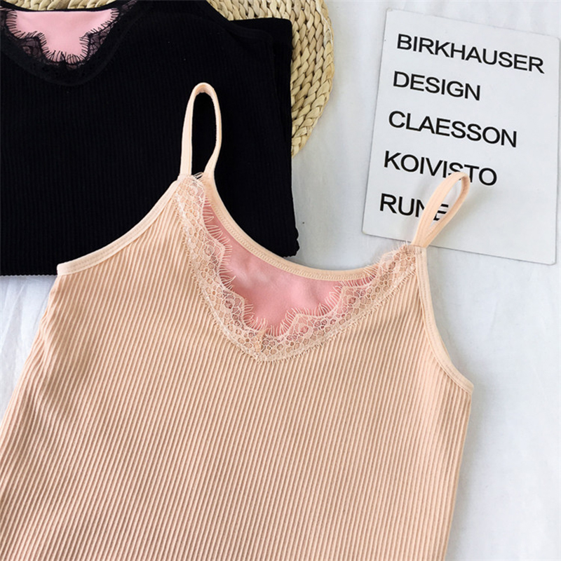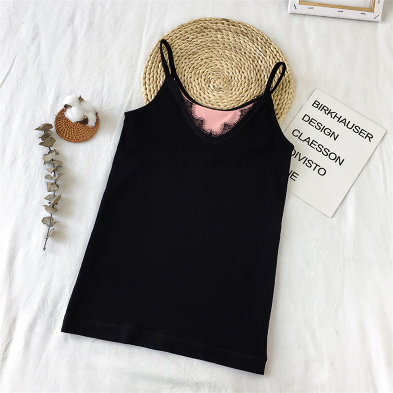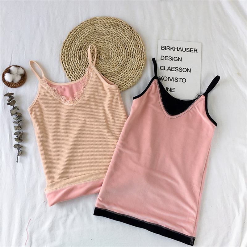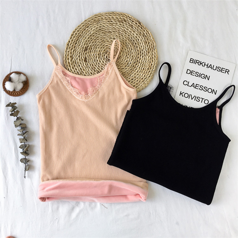 / 女2018秋冬新款蕾絲螺紋吊帶背心修身加絨加厚保暖黑色打底衫上衣