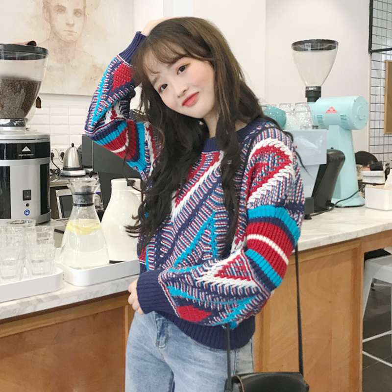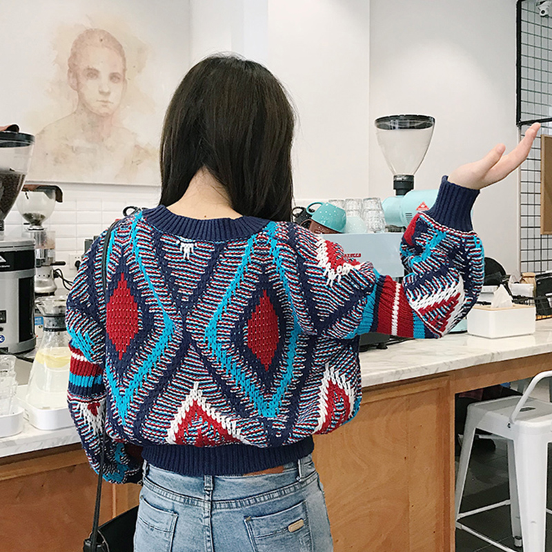 / 小清新慵懶風針織毛衣秋裝女新款寬松套頭短上衣學生時尚幾何外套