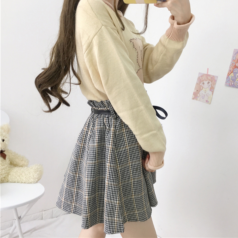 毛球系帶高腰顯瘦半身裙甜美少女秋冬裝新款學生復古格子A字短裙
