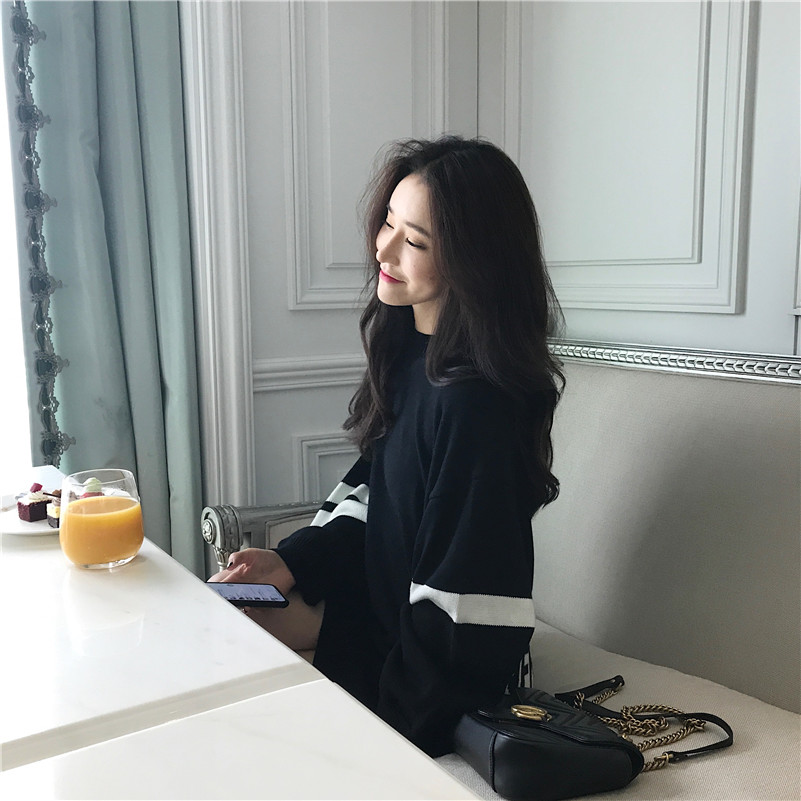韓版百搭慵懶風毛衣女2018新款寬松oversize條紋中長款毛線上衣潮