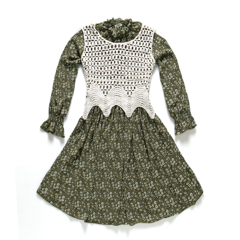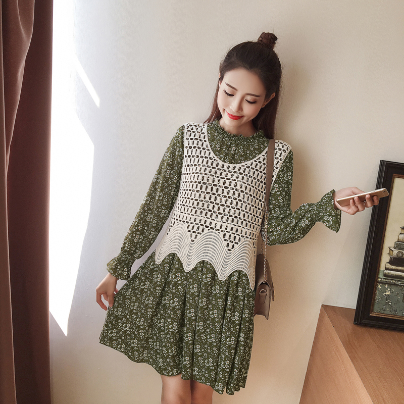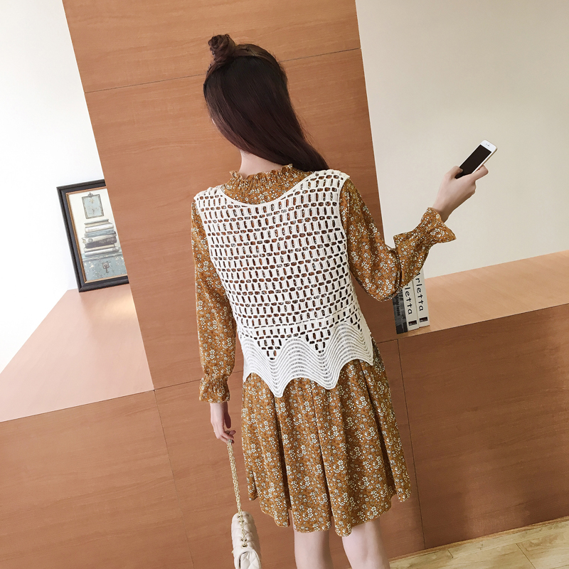 / 春裝新款女裝針織馬甲兩件套顯瘦復古碎花立領雪紡長袖連衣裙