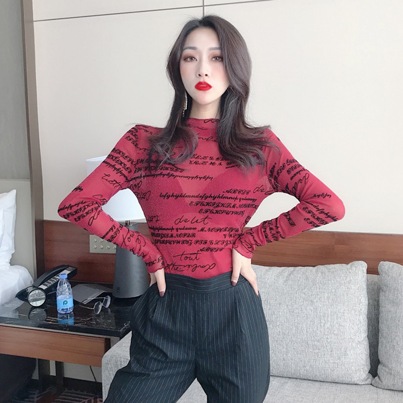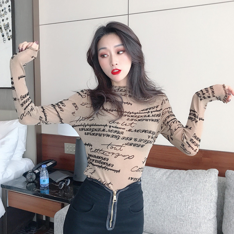chic港味半高領字母透視打底衫女秋冬裝2018新款韓版修身長袖T恤