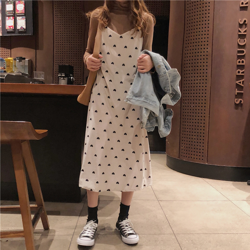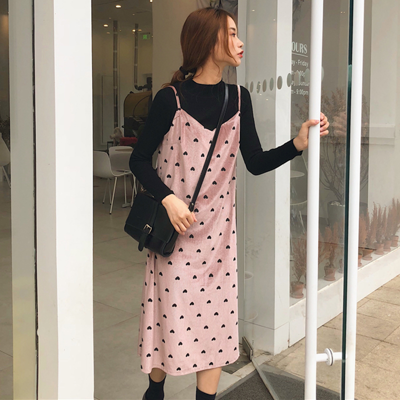 / 韓版甜美愛心吊帶連衣裙子女秋冬裝新款學生復古風絲絨egg中長裙