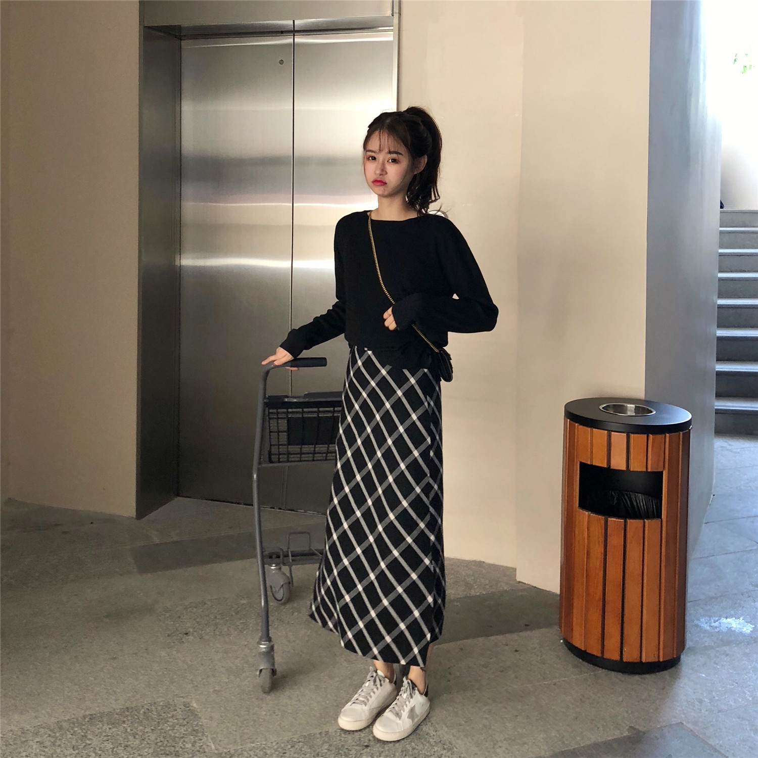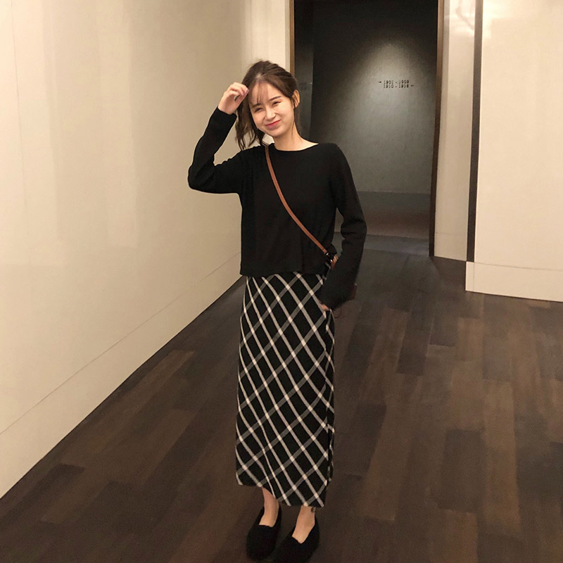 / 韓版慵懶風黑色開叉長袖針織上衣+格子百搭半身高腰A裙時尚兩件套