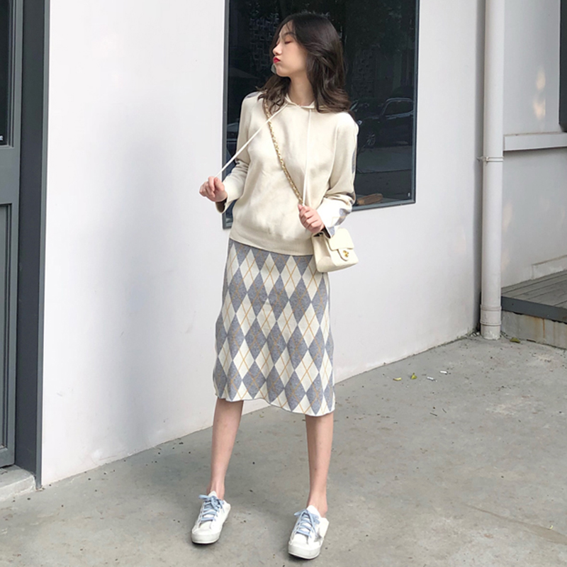 毛衣配裙子兩件套秋冬裝新款寬松連帽針織衫高腰顯瘦菱格半身裙子