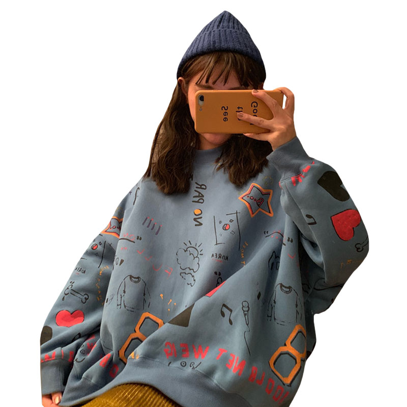 2018新款秋冬韓版寬松原宿風涂鴉加絨加厚套頭超火衛衣上衣外套女