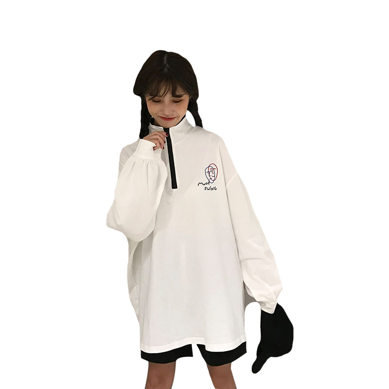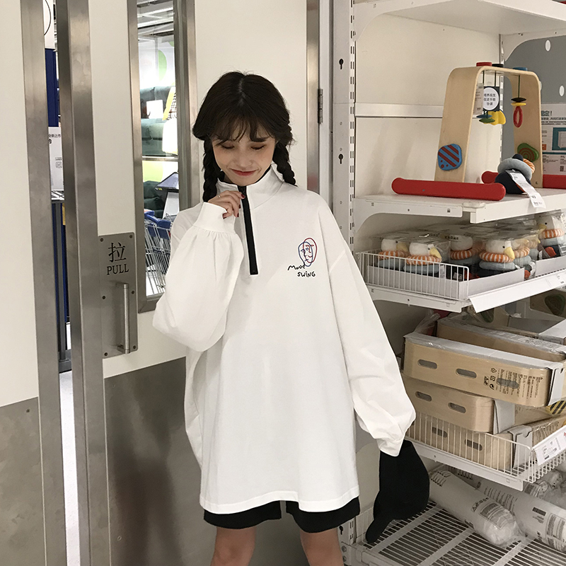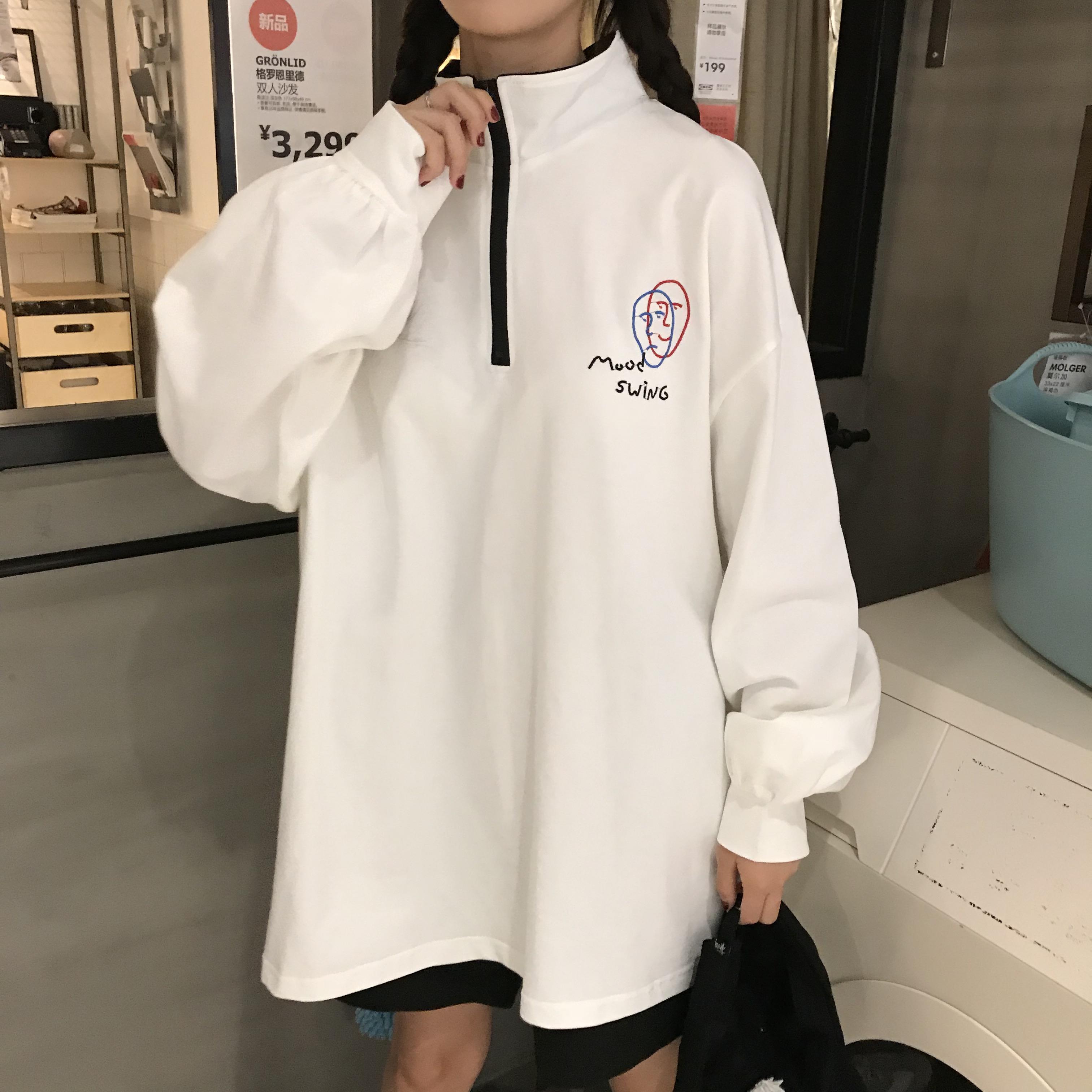 秋季女裝韓版寬松半高領拉鏈抽象卡通刺繡長袖套頭衛衣上衣外套潮