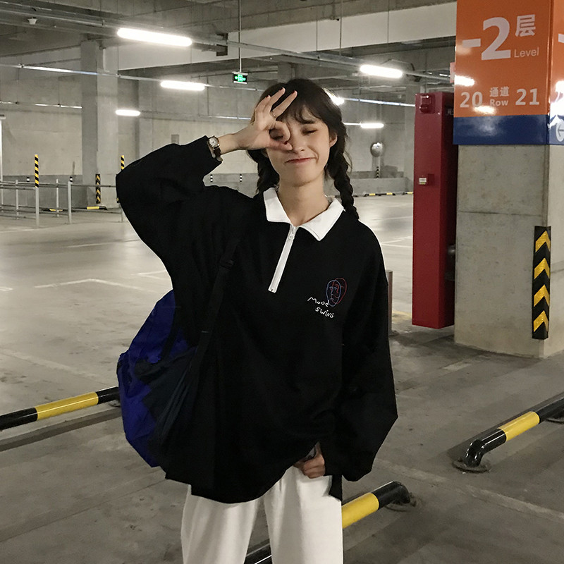 / 秋季女裝韓版寬松半高領拉鏈抽象卡通刺繡長袖套頭衛衣上衣外套潮