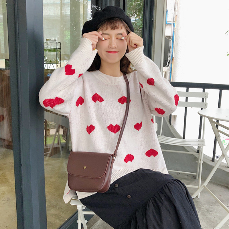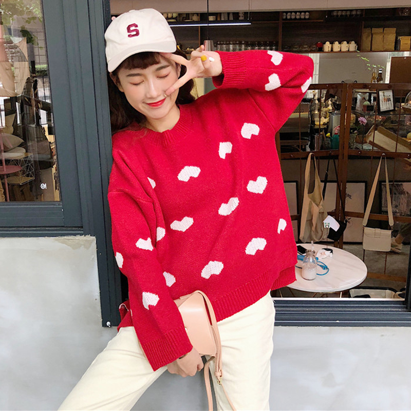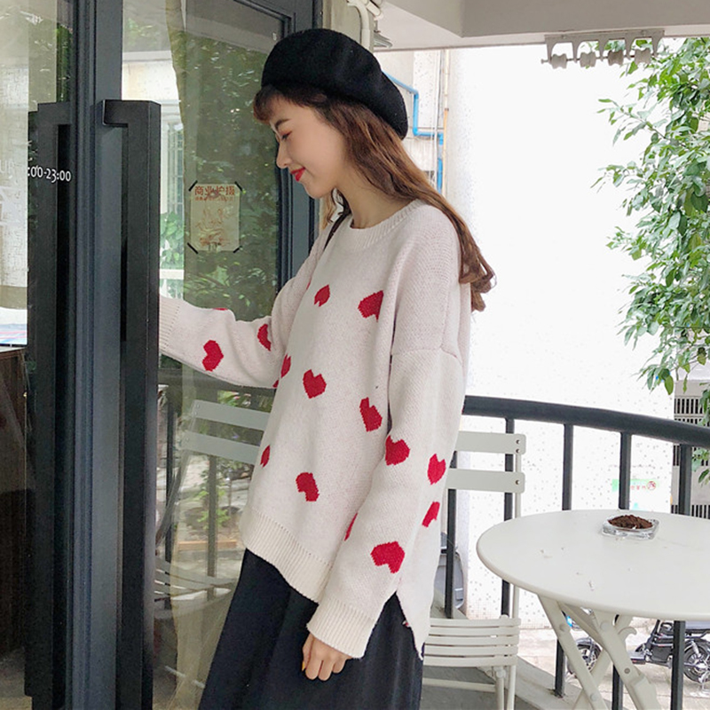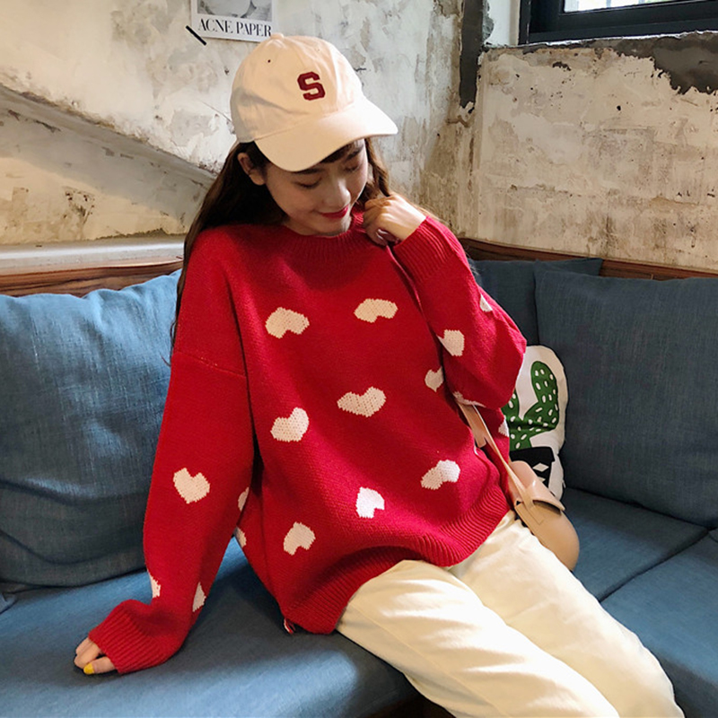 慵懶風撞色愛心毛衣外套女秋冬裝2018新款韓版寬松休閑長袖針織衫