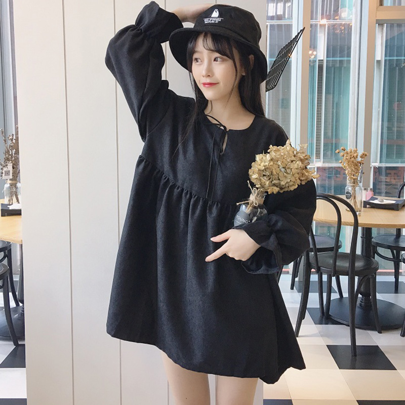 / 春秋新款女裝韓版小清新領口系帶寬松喇叭袖長袖連衣裙娃娃中長裙