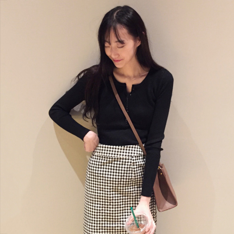 秋季新款女裝韓版包芯紗紐扣針織衫修身氣質顯瘦純色長袖打底上衣