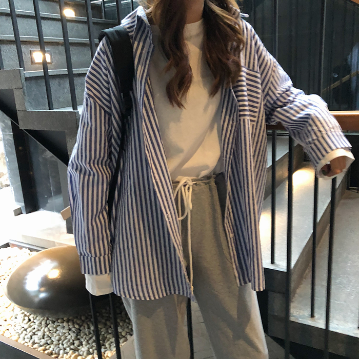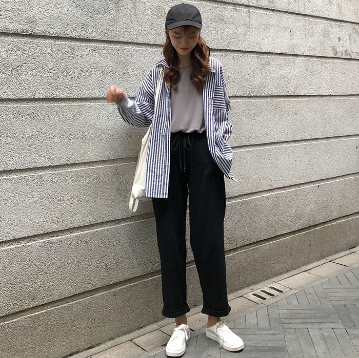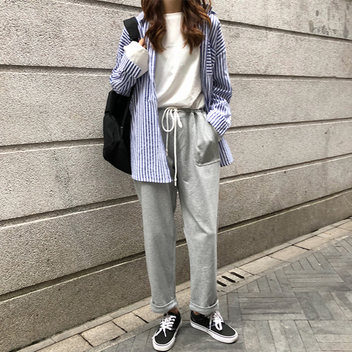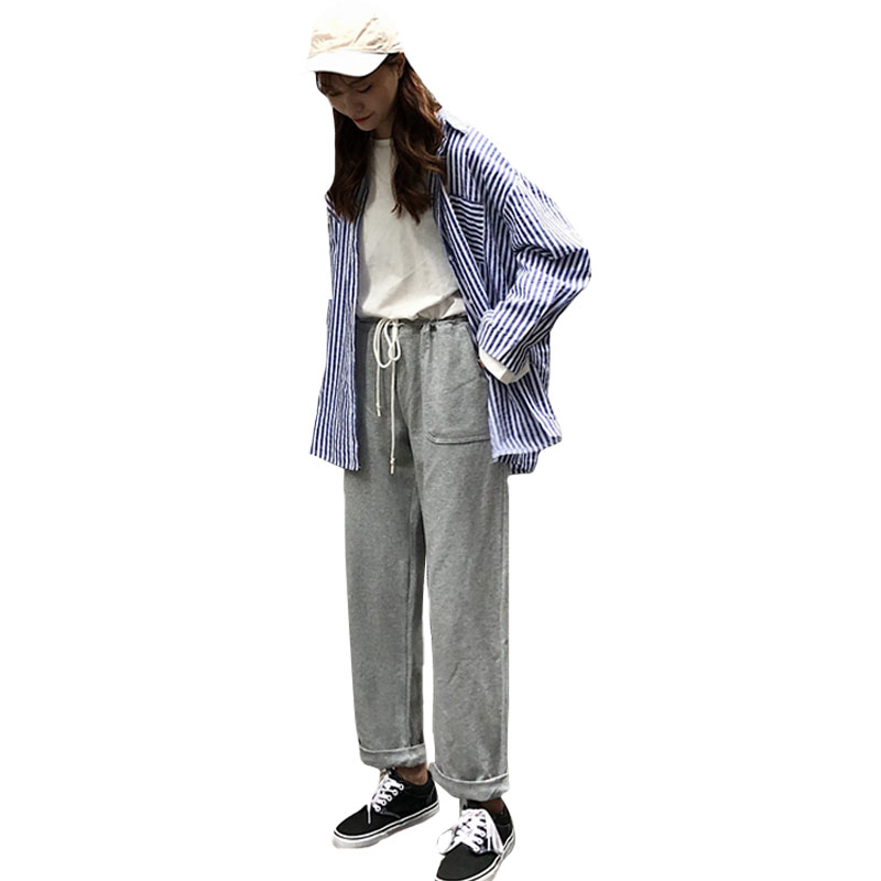 / 韓版時尚休閑套裝秋季長袖條紋襯衫外套+抽繩高腰直筒褲兩件套女