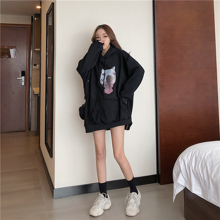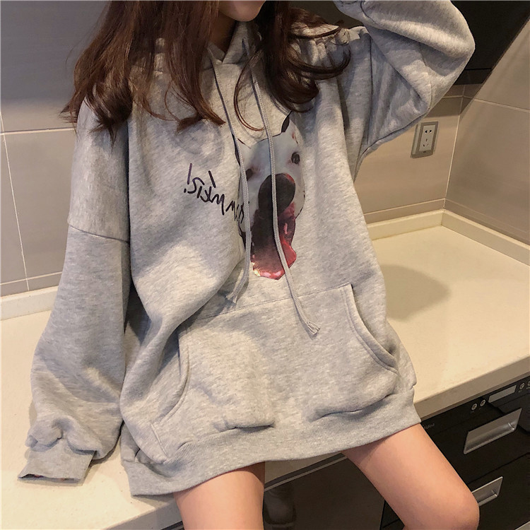 / 寬松連帽狗頭水印圖案加絨加厚下半身失蹤衛衣女秋冬2018新款上衣