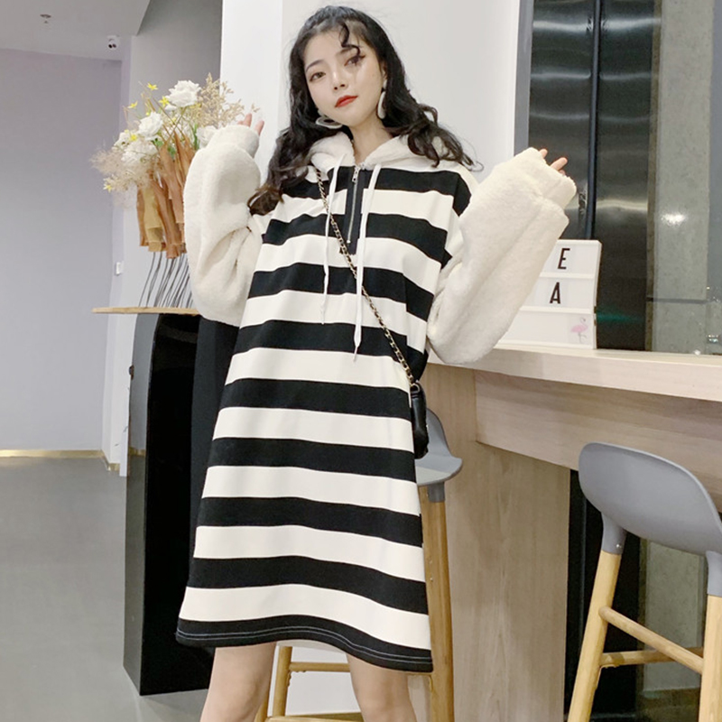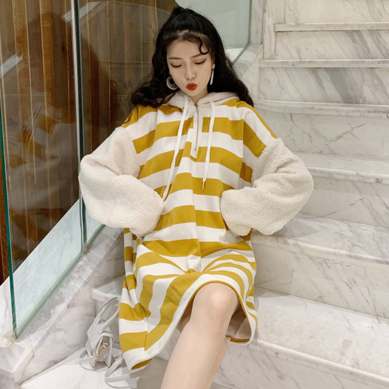 / 條紋連帽加絨衛衣2018新款女秋冬裝港風寬松中長款拼接羊羔毛外套