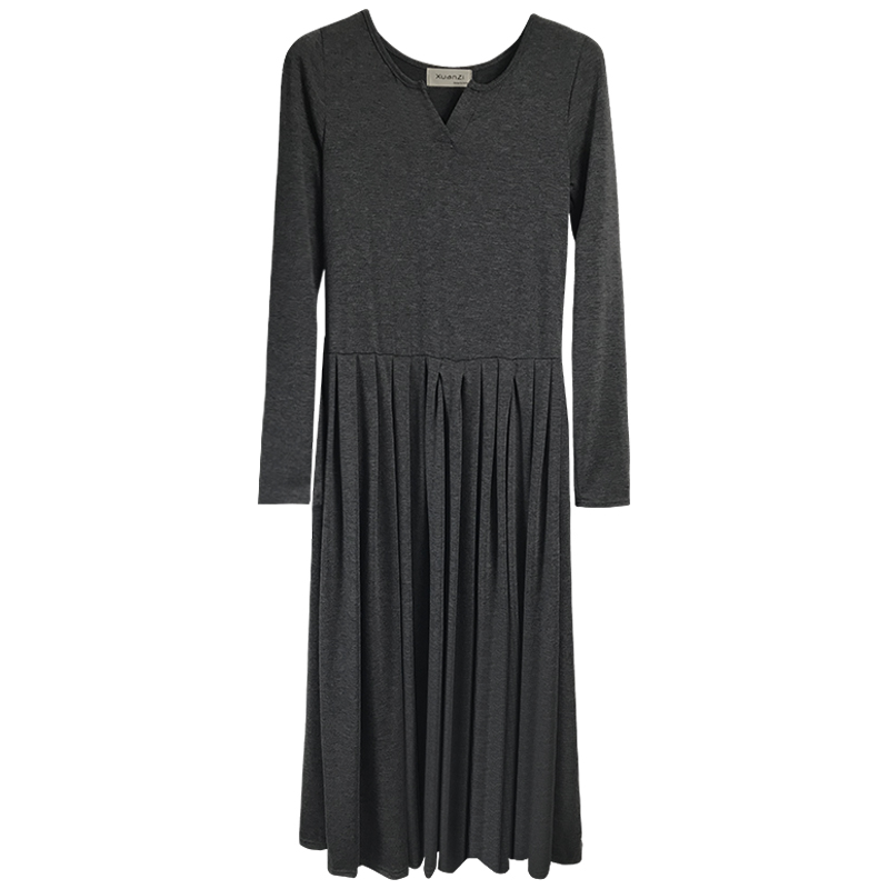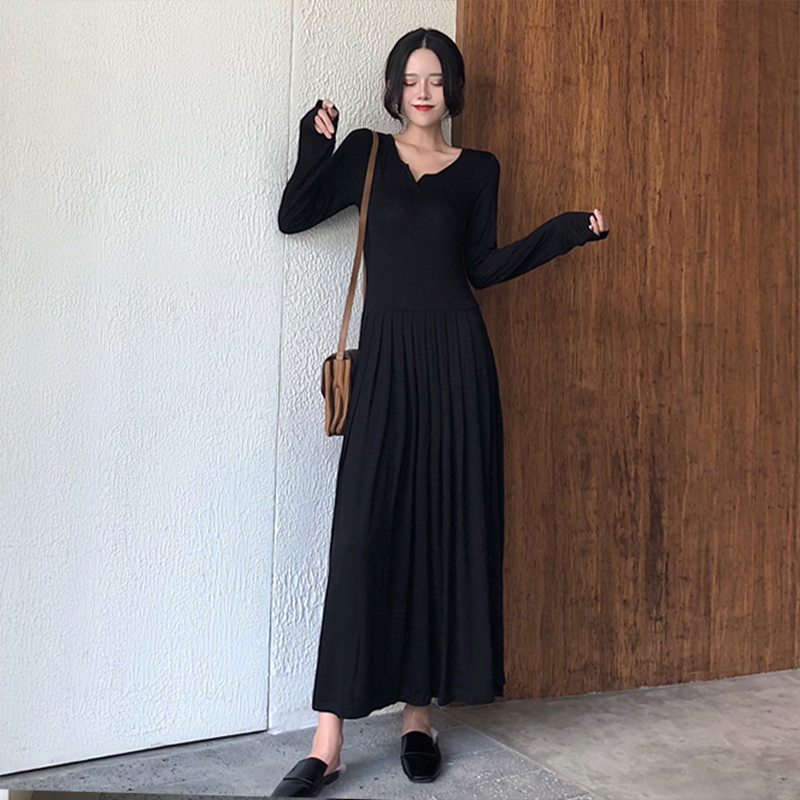 / 法式少女茶歇裙秋黑色修身連衣裙女秋長袖小黑裙百褶中長款打底裙