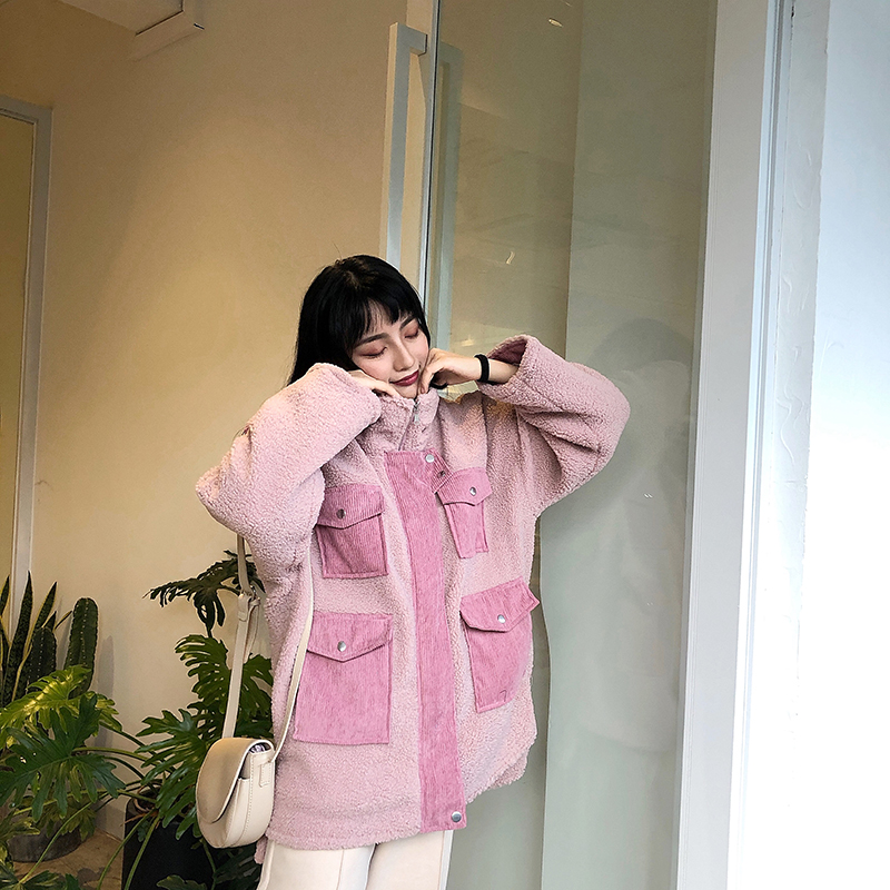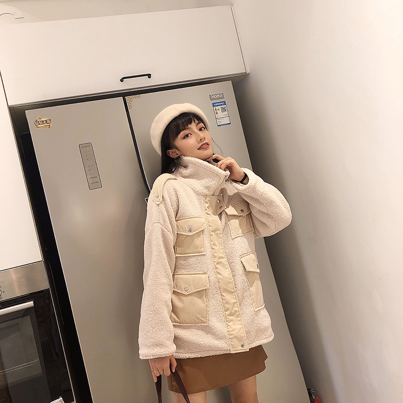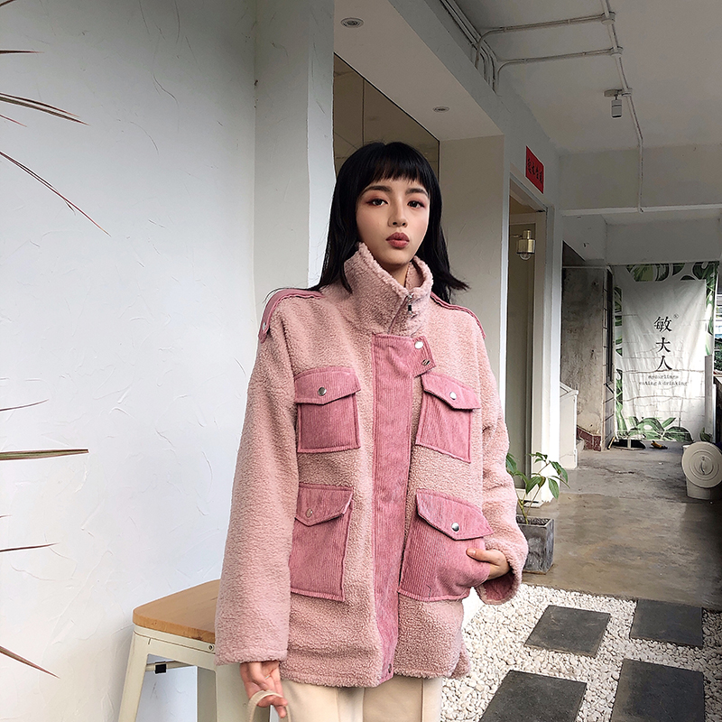 / 復古韓國chic風加厚保暖羊羔毛外套女2018新款冬季四口袋寬松絨衫