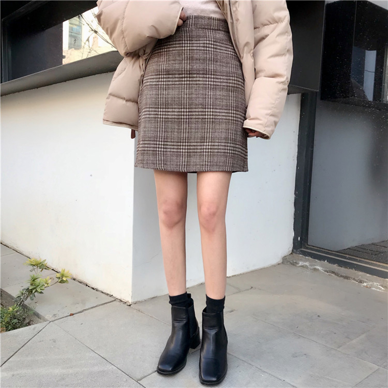 / 秋裝女2018新款韓版修身顯瘦高腰毛呢格子a字半身裙氣質包臀短裙