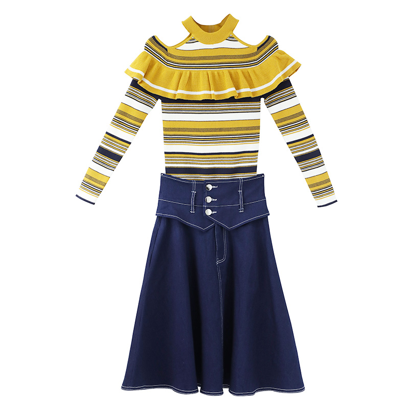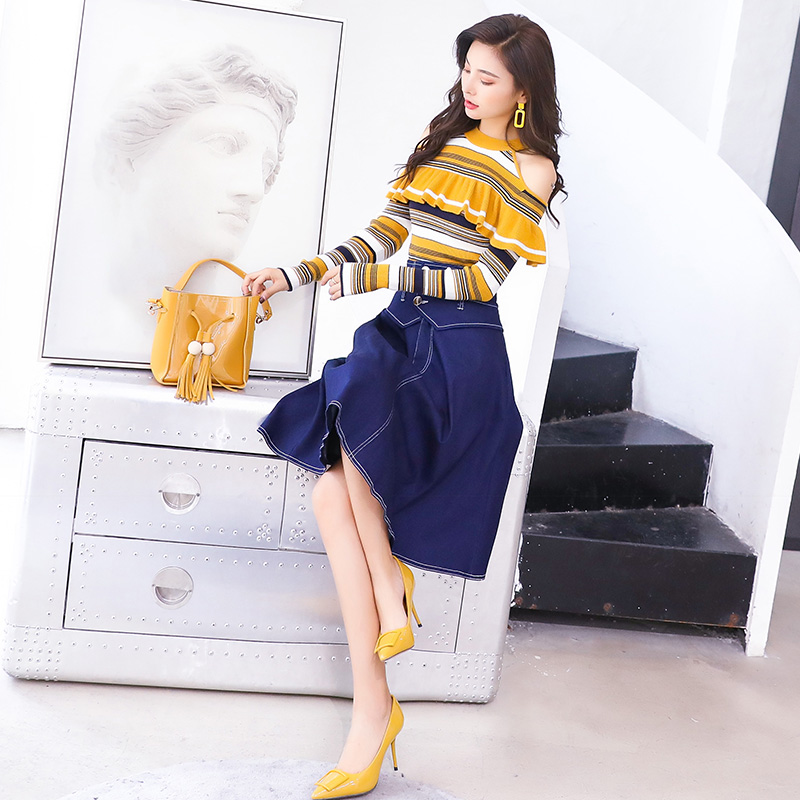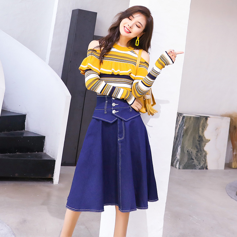 / 名媛氣質連衣裙女2018秋季時尚長袖露肩針織衫牛仔半身裙兩件套裝