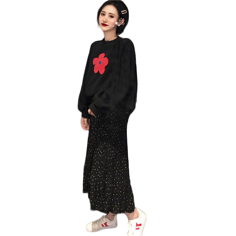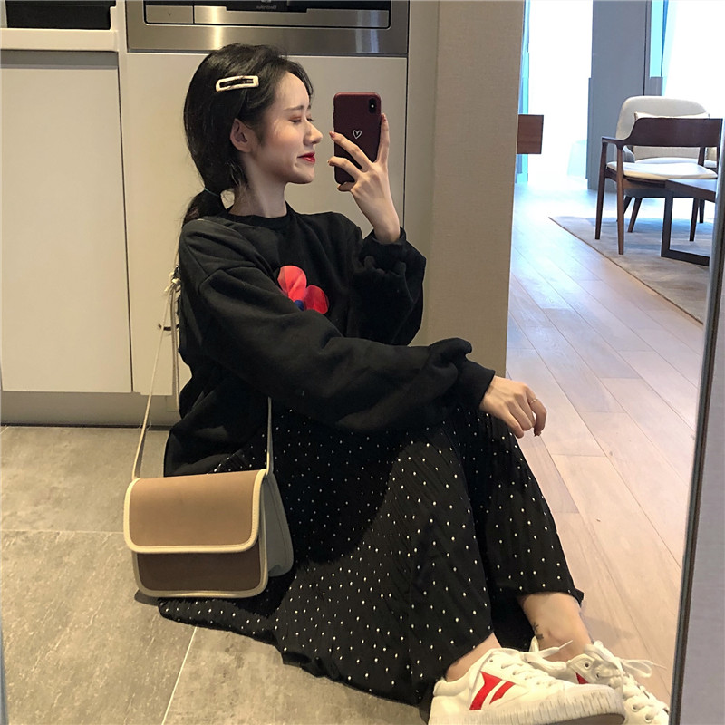 / 秋裝女2018新款套裝復古印花加絨衛衣女+百褶波點半身長裙兩件套