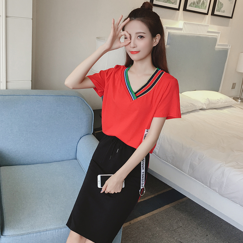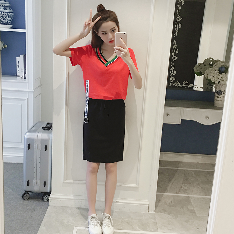 / 夏季新款女裝撞色V領中長款顯瘦休閑兩件套短袖連衣裙套裝潮