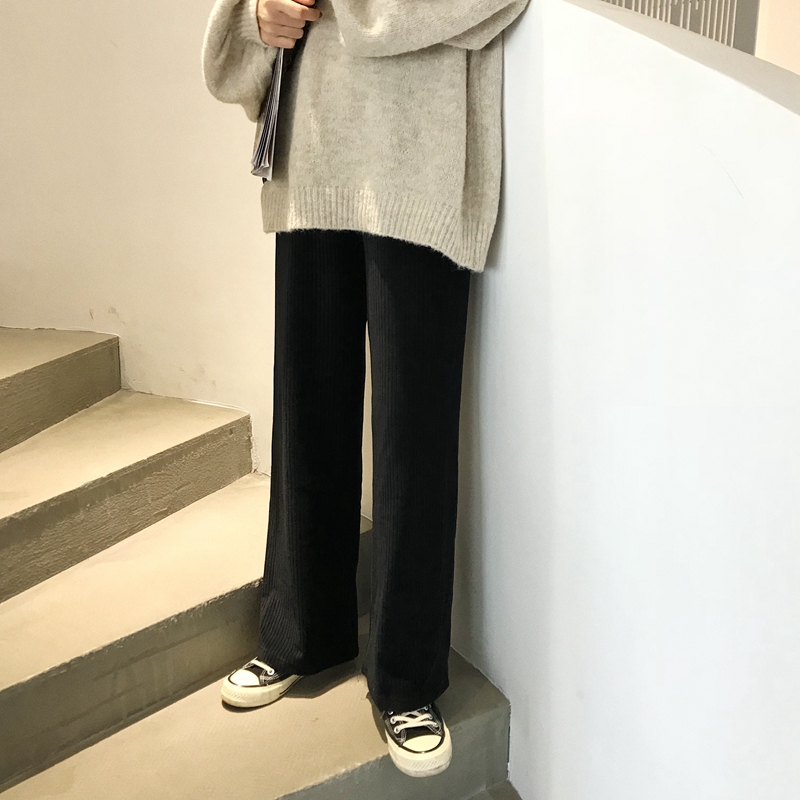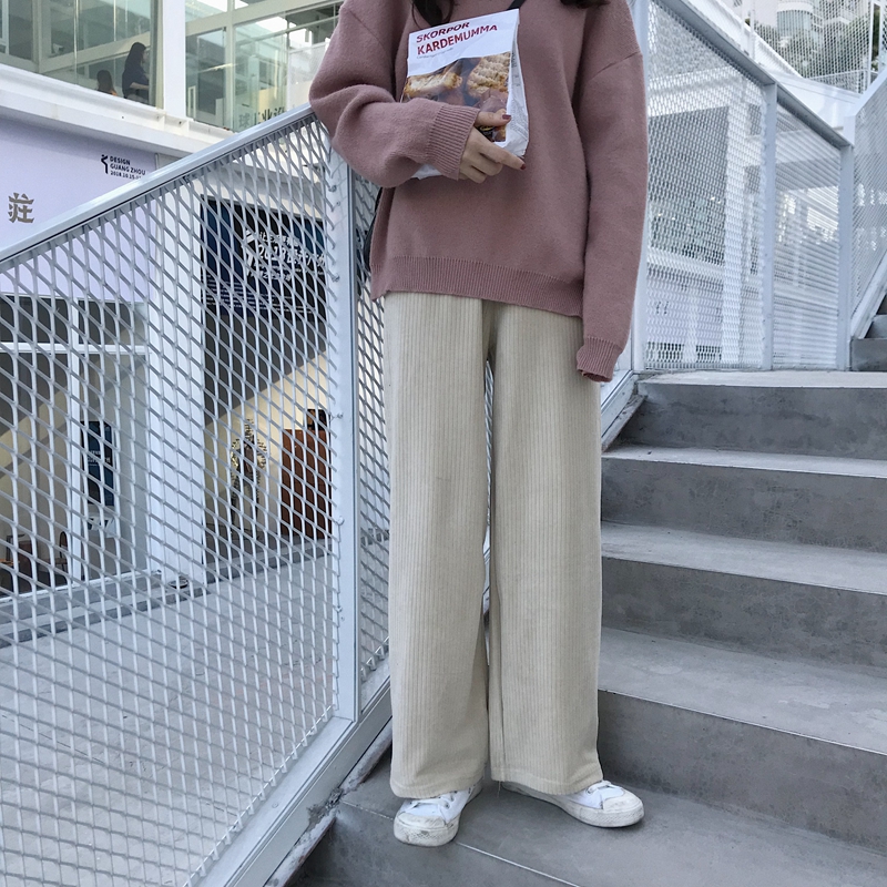 / 絲絨休閑褲女秋冬裝2018新款韓版高腰顯瘦坑條長褲學生寬松闊腿褲