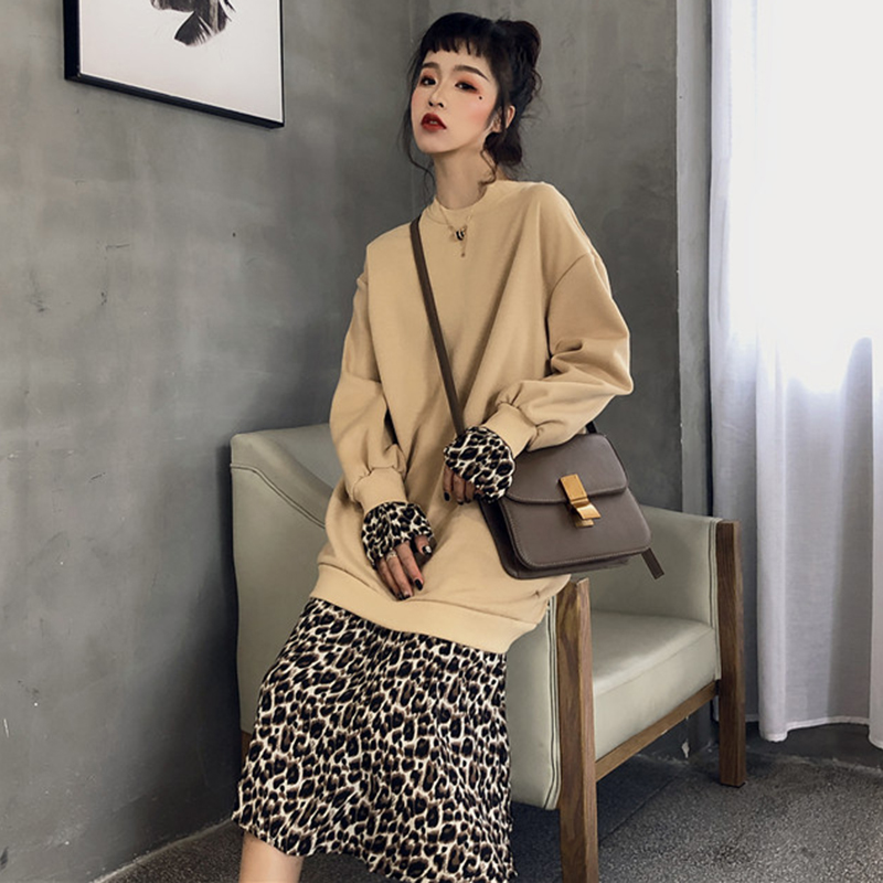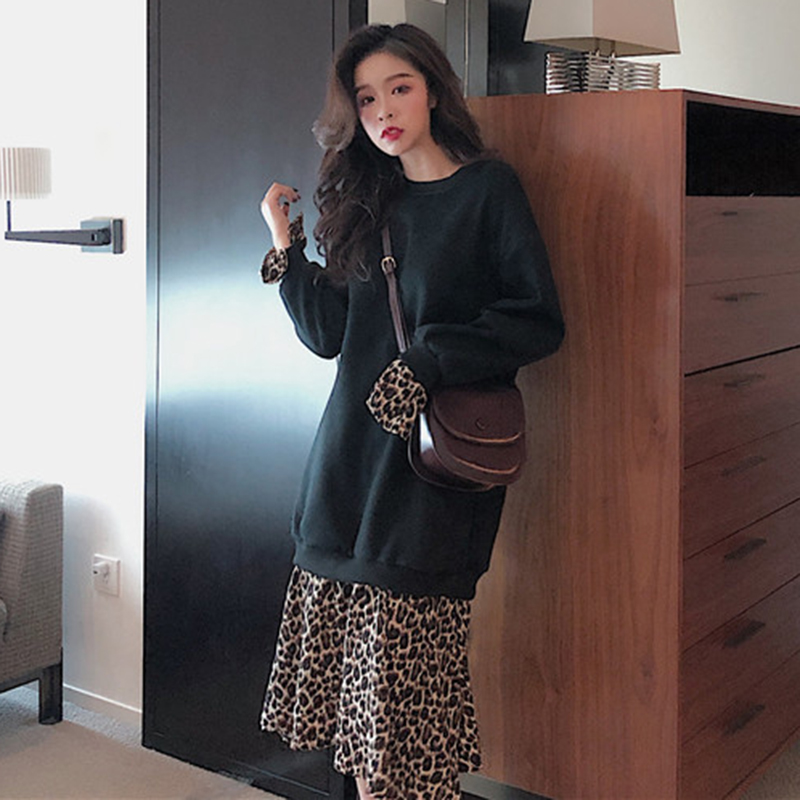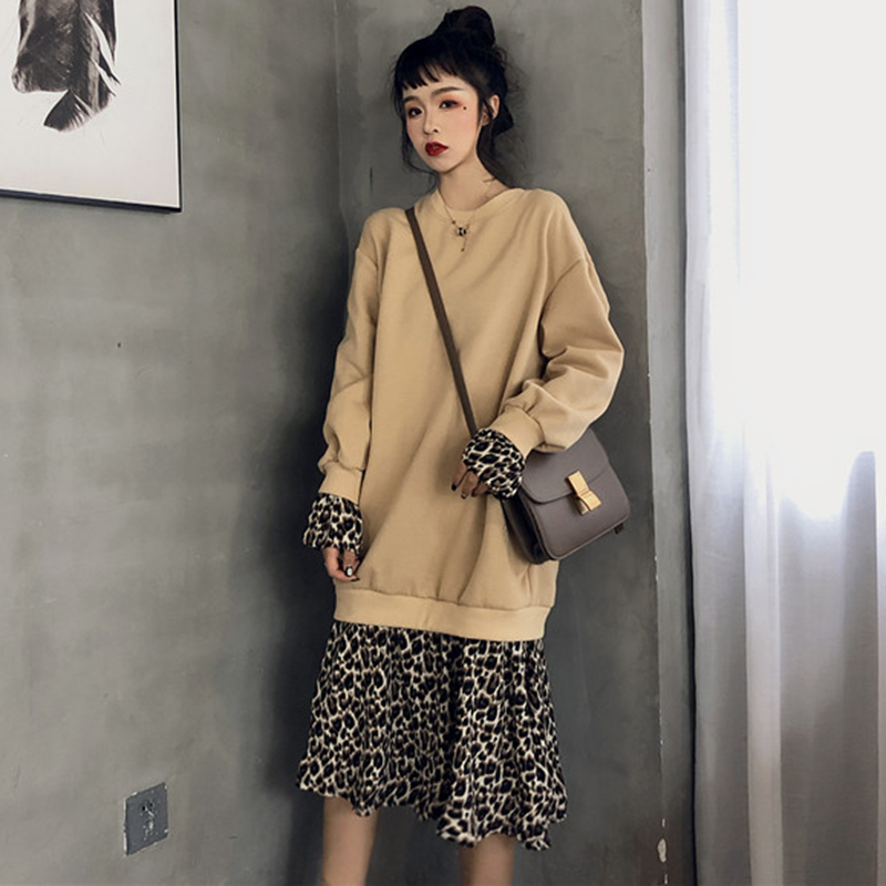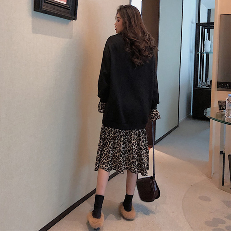 / 拼接豹紋假兩件連衣裙子女秋冬裝新款法式加絨中長款egg風桔梗裙