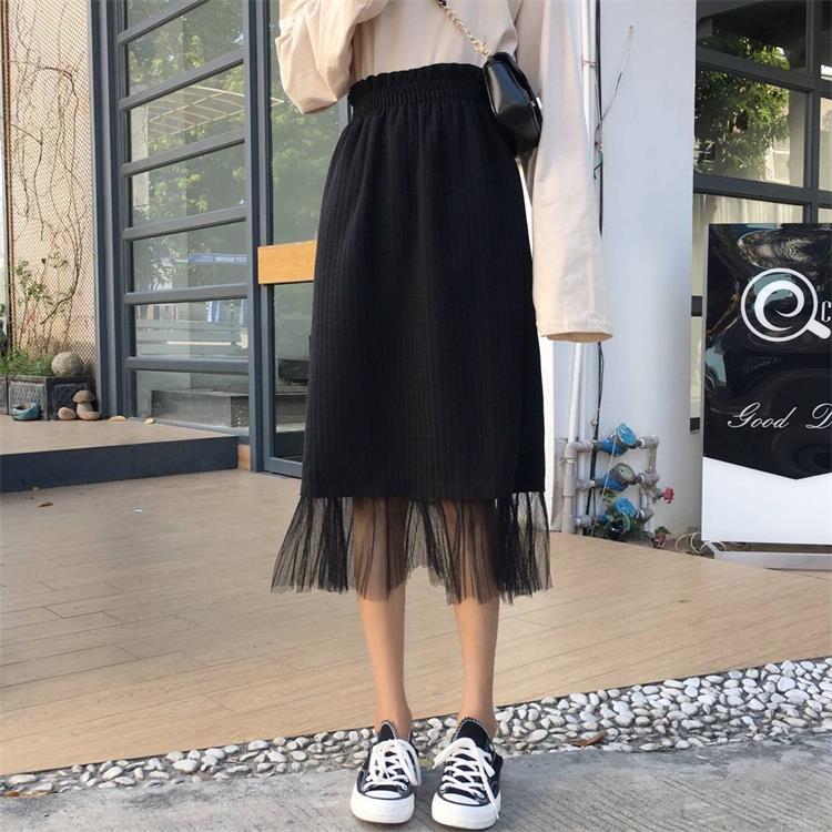 / 秋季韓版花苞高腰過膝網紗拼接半身裙中長款A字裙長裙學生裙子女
